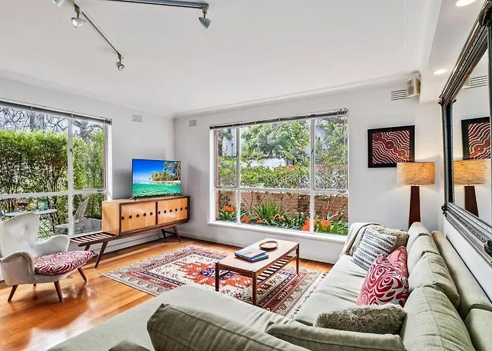 ベッドルーム1室のSensational Stylish And So Very South Yarra 2Br メルボルンアパートは、Flinders Street 鉄道駅から2kmで、王立植物園から徒歩で5分以内の場所にあります。